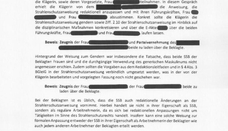 - Hintergrund der Weisung zum Gendern war insbesondere die Tatsache, dass beide SSB [Strahlenschutzbeauftragten] der Beklagten Frauen sind und die durchgängige Verwendung des generischen Maskulinums nicht angemessen erschien.